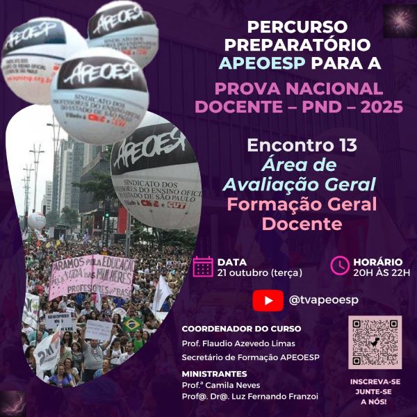 Venha com a gente, com sua presença, sua voz e sua história, transformar a preparação para a PND em uma jornada de consciência, crítica e alegria coletiva! Traga sua energia, sua experiência e sua voz – cada encontro é um ato de resistência, coragem, cuidado e de amor à Educação Pública, coletivo e junto com a APEOESP.